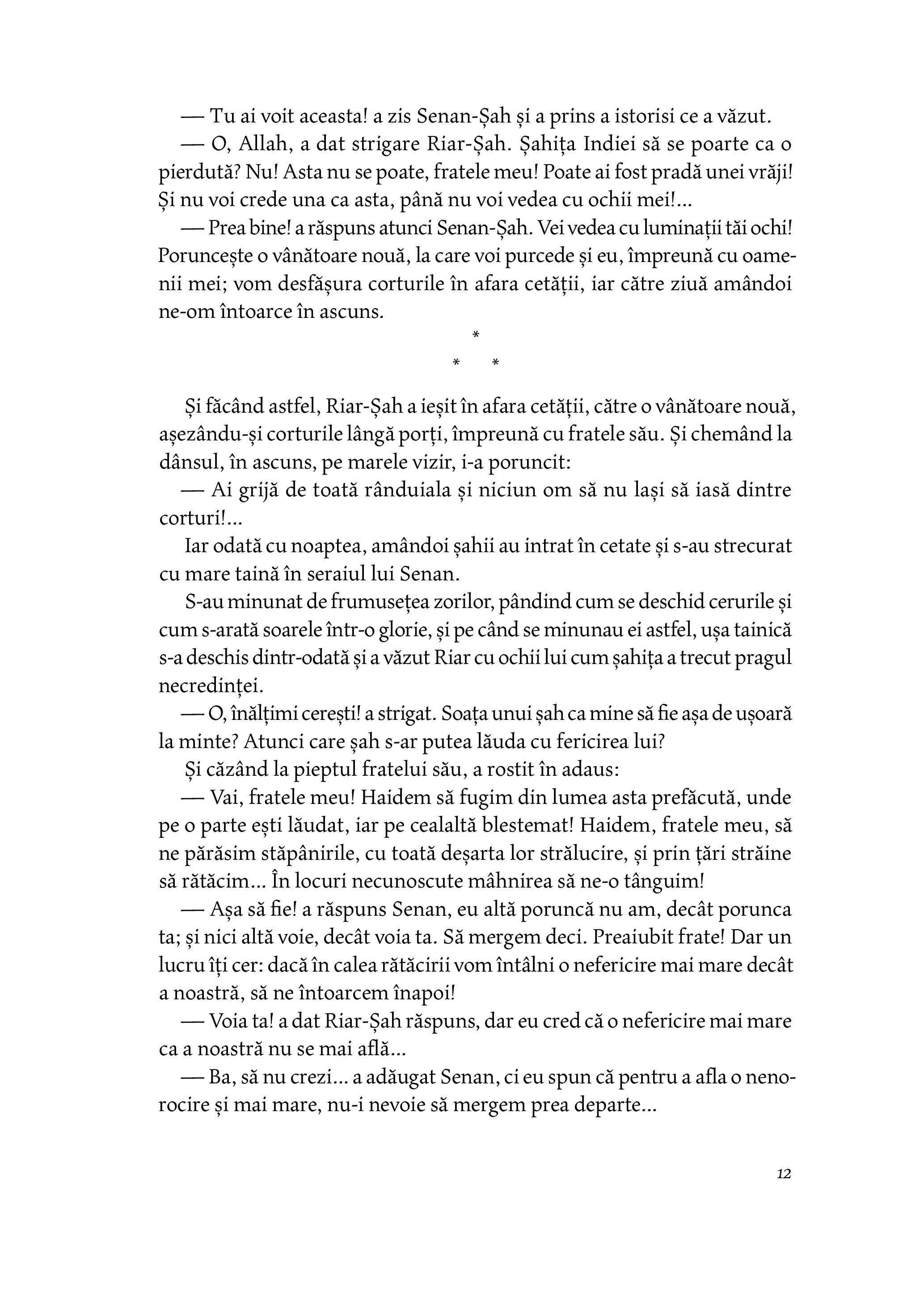 De o frumusete aparte, aceasta prima adaptare romaneasca pentru copii a celor 1001 de nopti a vazut lumina tiparului la mijlocul secolului trecut si a aprins imaginatia a generatii de tineri cititori.Povestile depanate de iscusita Seherazada de-a lungul a o mie si una de nopti spre desfatarea sotului sau, preaputernicul Riar Sah, sunt pesemne cele mai cunoscute din toata literatura lumii. De la peripetiile lui Aladin, stapanul lampii fermecate, la epopeea lui Sindbad marinarul si de la nazdravaniile lui Ali Baba si ale celor patruzeci de hoti la ispravile lui Harun al-Rasid, califul-califilor, basmele arabe zugravesc lumi fara seaman, neintrecute in frumusete si farmec.Costuri Transport & Retur