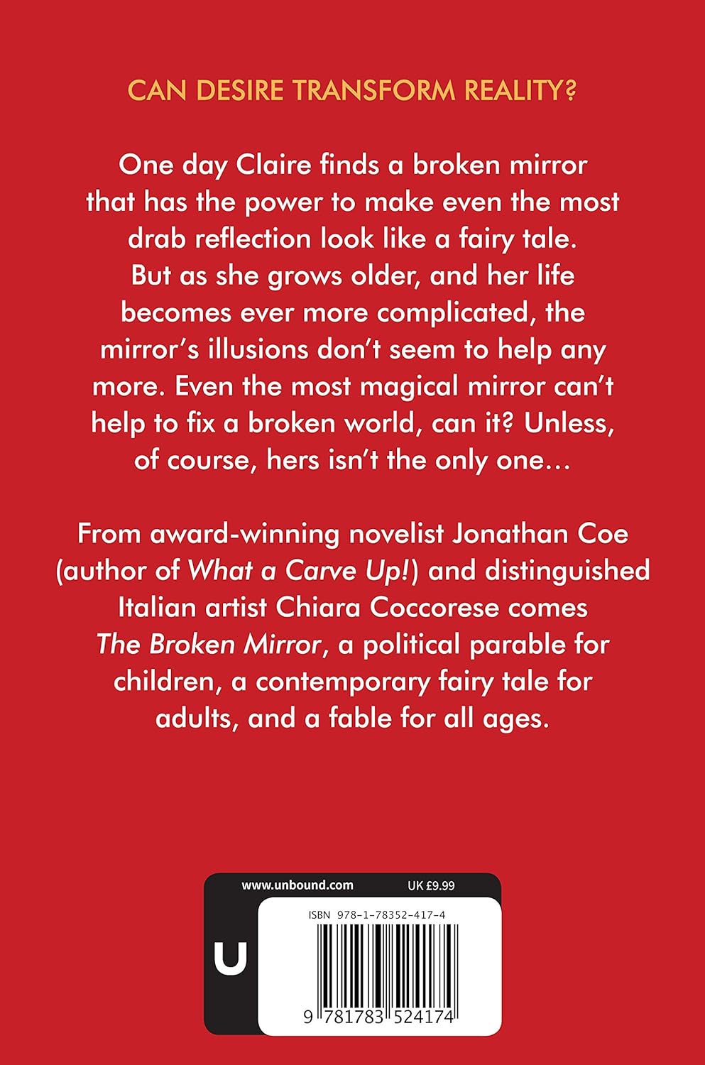 Can desire really transform reality? From award-winning novelist Jonathan Coe and distinguished Italian artist Chiara Coccorese comes The Broken Mirror, a political parable for children, a contemporary fairy tale for adults, and a fable for all ages.One day Claire, to escape her quarrelsome parents, takes refuge in the dump behind her house. There she finds a broken mirror, a nasty piece of sharp glass… yet she is strangely drawn to it.She soon discovers it has the power to transform even the most drab reality into a fairy-tale world: the grey sky is reflected blue, and Claire’s modest, suburban house is transformed into the most beautiful castle. As Claire grows older, always accompanied by her magic mirror, she can see her face without her teenage acne, and her town before it fell victim to thieving property developers. But, in reality, libraries are being turned into luxury flats wherever she looks, and the boy Claire loves is instead her worst enemy.