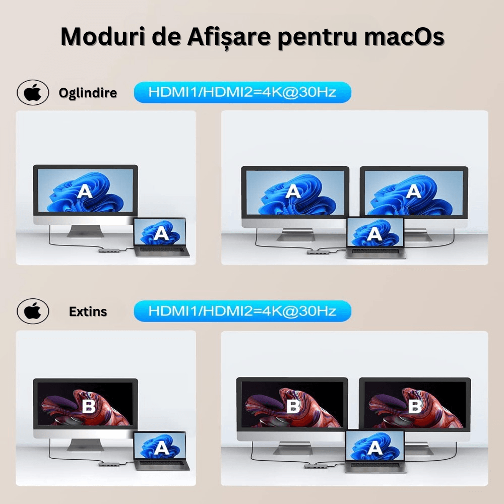 ? Hub Adaptor Multiport 10 in 1 USB-C – Conectivitate Extinsa & Performanta Maxima!/n? Transforma-ti laptopul intr-un centru de conectivitate ultra-performant! Acest hub USB-C 10 in 1 iti ofera acces rapid la mai multe porturi esentiale, astfel incat sa poti lucra mai eficient, sa te bucuri de filme la calitate 4K Ultra HD sau sa ai o conexiune stabila la internet, fara intreruperi. Indiferent daca ai nevoie de transfer rapid de date, conectarea mai multor monitoare sau incarcare ultra-rapida, acest hub este solutia ideala pentru laptopuri, MacBook, tablete si Chromebook./n/n/n? Conectivitate Extinsa & Functionalitate Premium/nAcest hub multifunctional iti ofera 10 porturi esentiale pentru orice activitate profesionala sau de divertisment:✅ 2 x HDMI 4K@30Hz – Bucura-te de afisaj dual pe doua monitoare pentru o productivitate sporita.(Nota: macOS suporta doar modul oglinda)✅ 2 x USB 3.1 (10Gbps) – Transfera fisiere mari in doar cateva secunde, fara lag.✅ 1 x USB-C (10Gbps) – Viteza maxima pentru dispozitivele moderne.