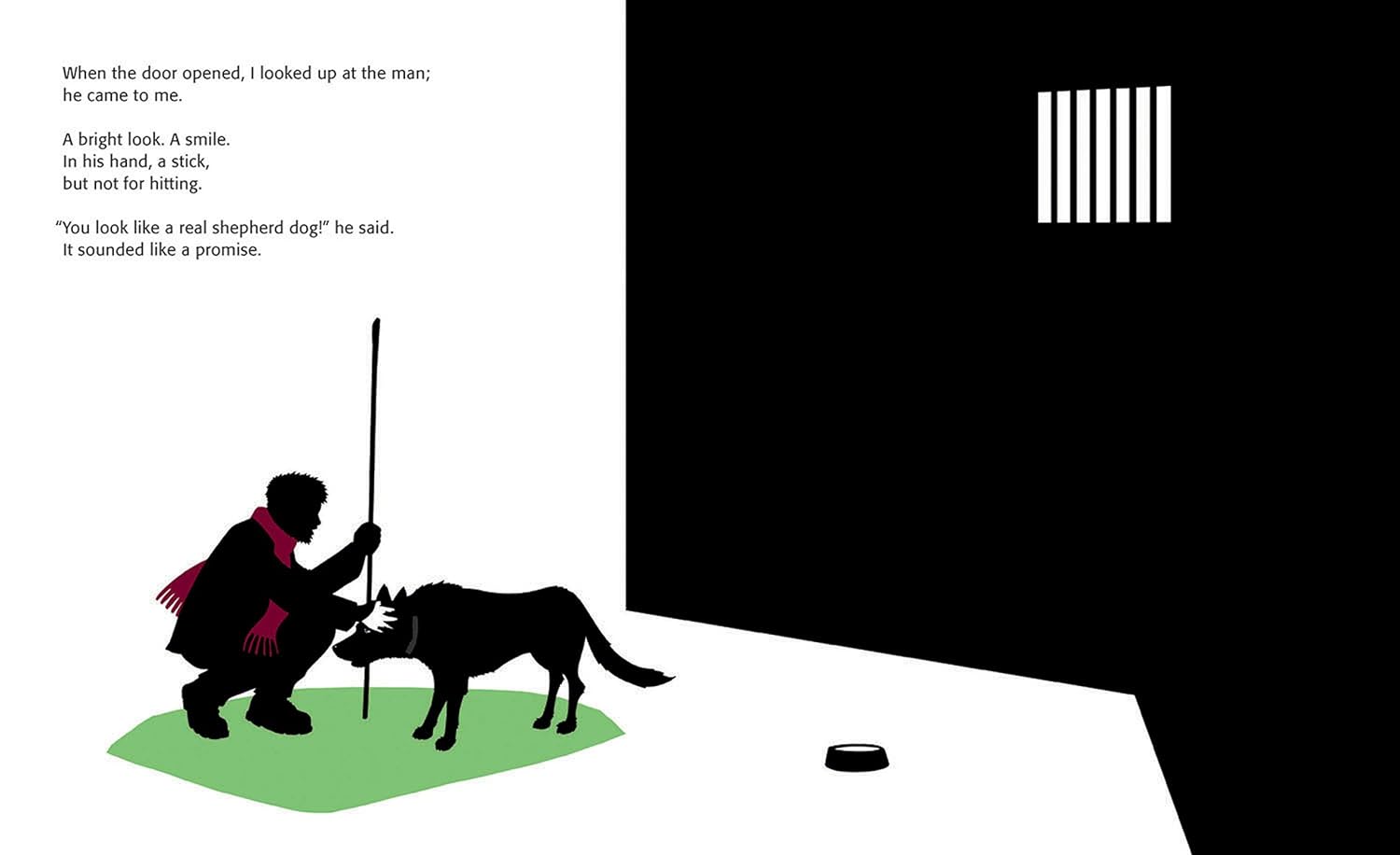 A sad and lonely dog, chained to a concrete slab by an abusive owner, tells how his wolf-like appearance and nighttime howling has led humans in the city neighborhood to misunderstand him. He longs for the freedom to run and the touch of a friendly hand. Taken to an animal shelter, the abandoned dog loses hope of being rescued until a man carrying a long, thin stick reaches through the bars to pat him on his back and says, "You look like a real shepherd dog!" Now, the dog reports, he spends his days tending sheep in the fields and his nights beside his shepherd, singing to the moon.Black-and-white silhouette illustrations dramatically show the transformation of this mistreated dog, whose life is changed by one caring individual. Carolyn Angus, Literacy Daily