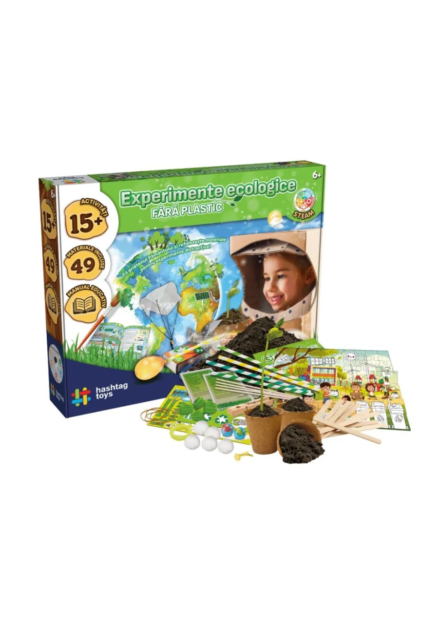 Descopera stiinta ecologica cu acest SET EXPERIMENTE ECOLOGICE educativ perfect pentru a invata despre sustenabilitate si protejarea planetei! Cu aceasta jucarie vei realiza experimente amuzante si interactive care arata cum stiinta poate ajuta la protejarea naturii. Invata cat de important este fiecare gest si cum micile schimbari pot avea un impact mare pentru viitorul planetei noastre. Ideal pentru tinerii oameni de stiinta care vor sa inteleaga impactul asupra mediului si sa dezvolte obiceiuri eco-friendly &mdash Green Science este un pas distractiv si constient catre o lume mai verde! Continutul kitului puzzle Green Science (60 de piese), cartonas cu elemente grafice, paie de hartie, stickere decorative, spatule din lemn, ghivece biodegradabile, benzi de cauciuc, sfoara din lana, piuneza de hartie (tip split), bete din lemn, bile de bumbac, carlig de lemn (tip cleste), agrafe de birou, fire modelabile, bile de sticla, seminte de fasole verde, seminte de creson (nasturel), sol, pamant.