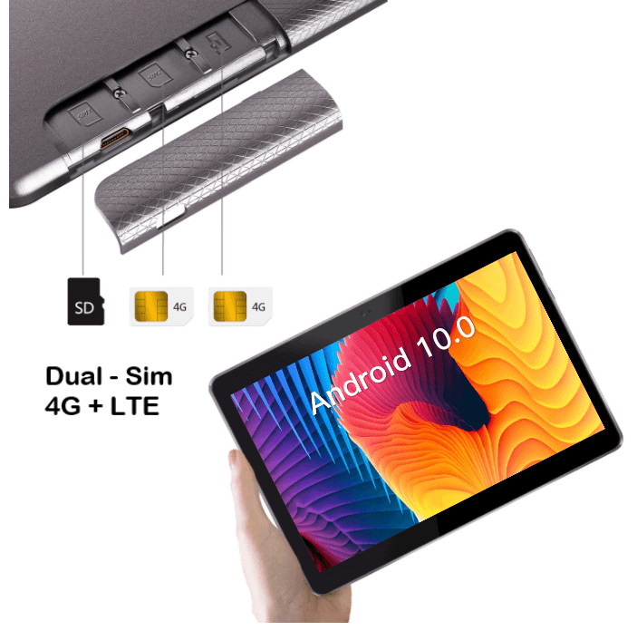 modelul T12 (2020, 10,1”) are o baterie de 5000 mAh, pentru utilizare prelungita. Cu aceasta baterie puternica, te poti bucura de ore lungi de vizionare si mobilitate sporita, departe de prize.Dual SIM + 4G Tableta T12 Dual SiM este capabila sa opereze in 2 retele simultan.