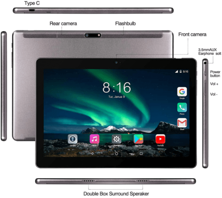 Descriere Tableta T12, Octa Core 1.6Ghz, Display 10.1” HD, Android 10, 2GB RAM DDR4, 32 GB, Wi-Fi , 4G LTE, Dual-Sim ,Ultra-Slim